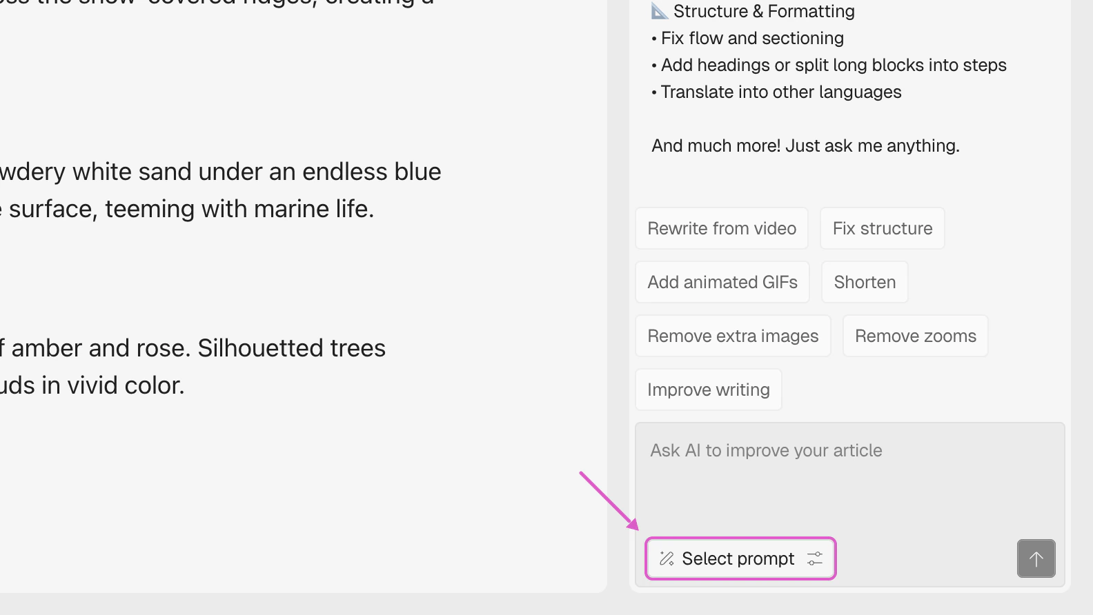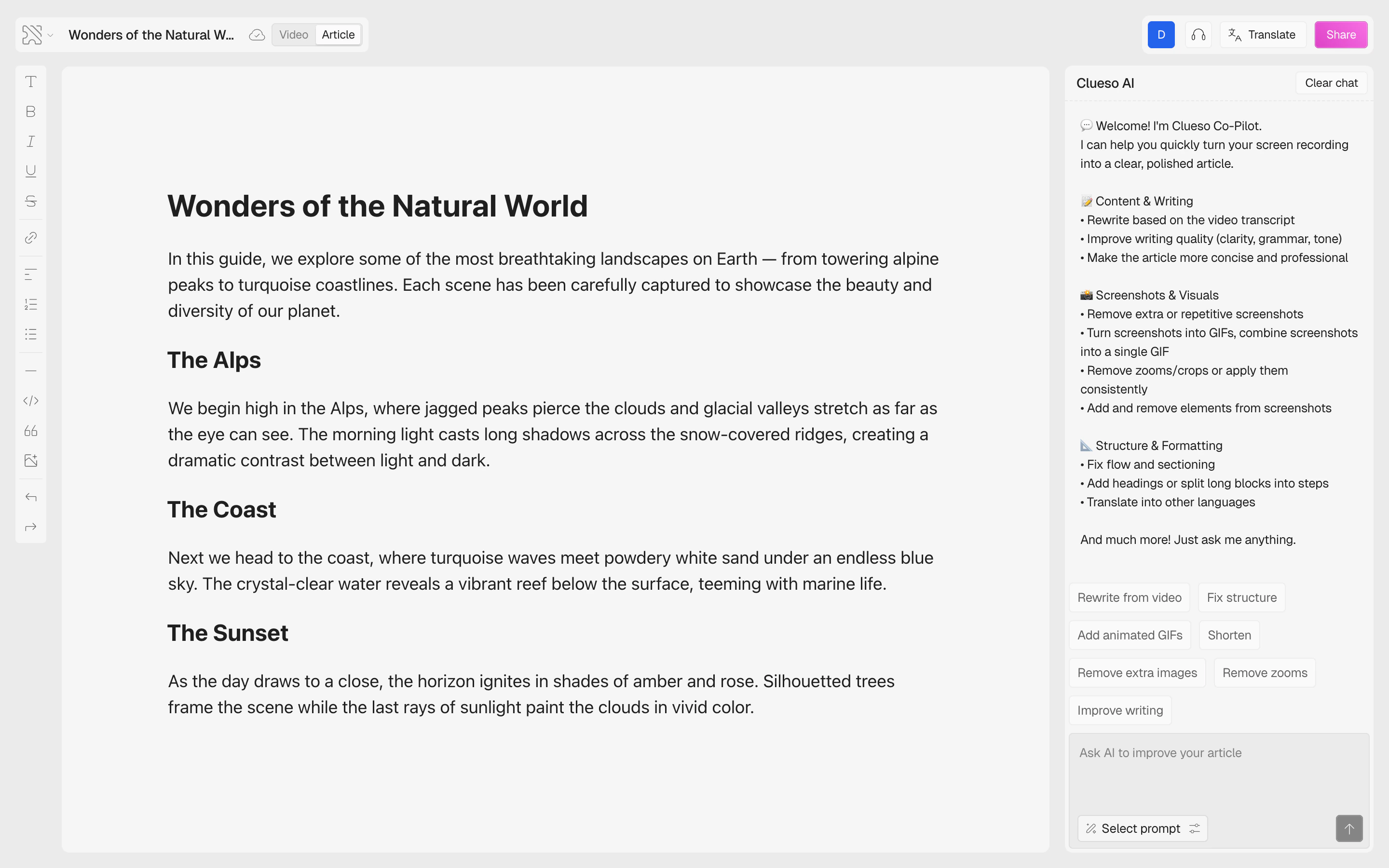 The Clueso AI co-pilot in the article editor uses your selected prompt as a baseline for all interactions. When you:- Click a suggestion pill (e.g., “Rewrite from video”, “Fix structure”, “Shorten”)