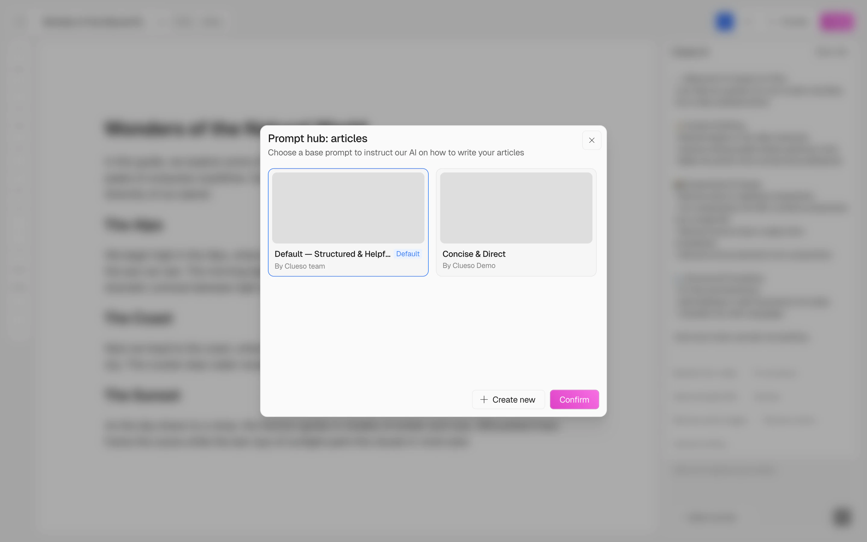The Prompt Hub shows all available prompts as cards. The currently selected prompt has a blue border. Clueso provides a default prompt (marked with a “Default” badge) that produces clear, well-structured articles.