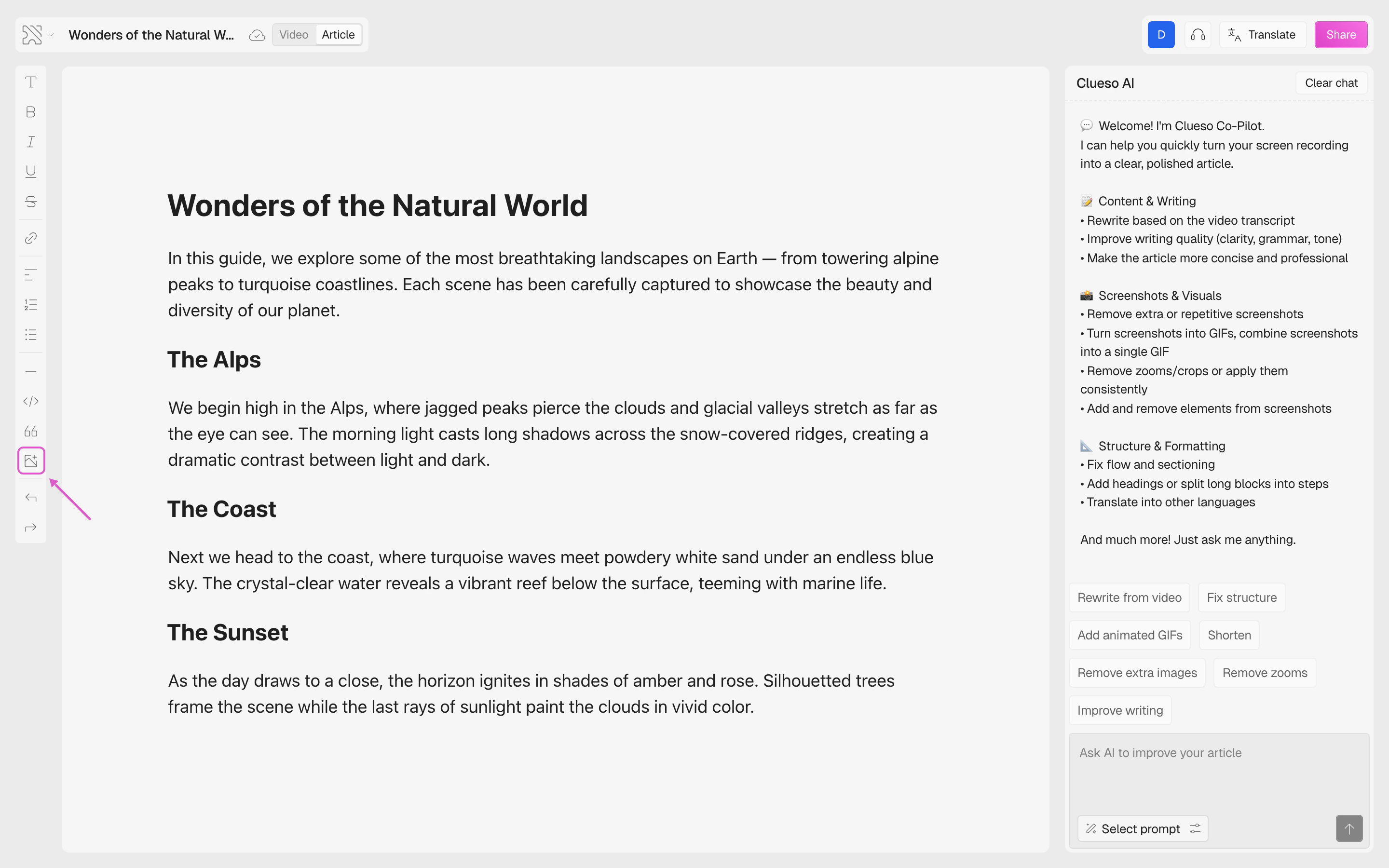 Switch to the Article tab and position the cursor at the point in your article where you want to add the screenshot.