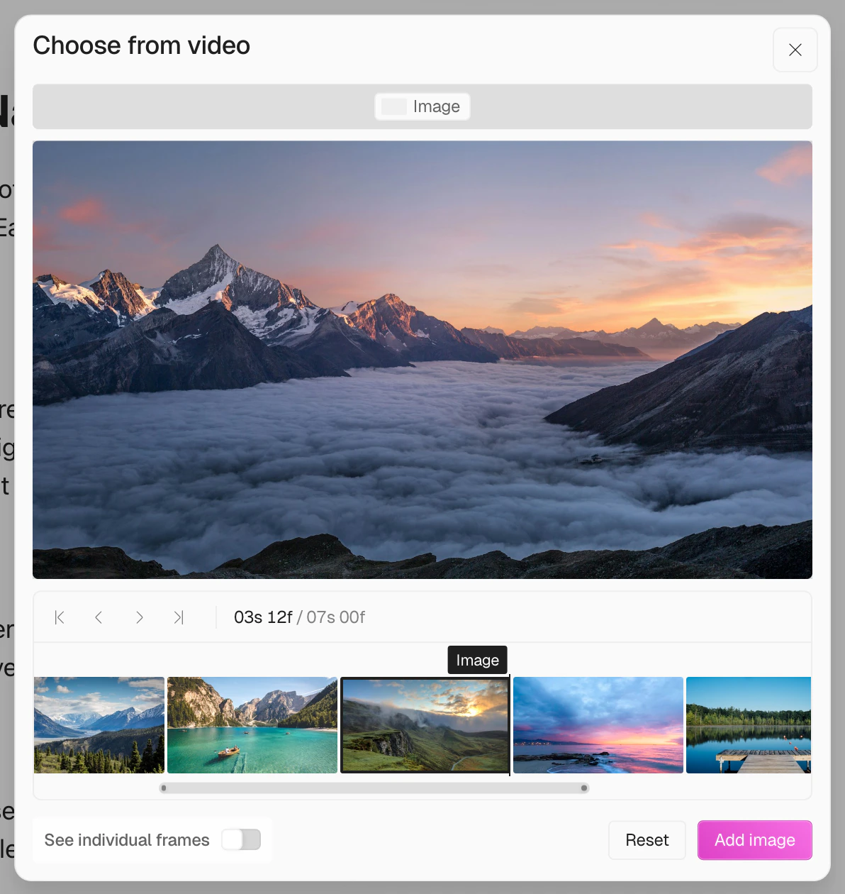 If you selected Choose from video, a frame picker dialog opens. Use the timeline scrubber to browse through the video and find the exact frame you want. You can toggle See individual frames for finer control.