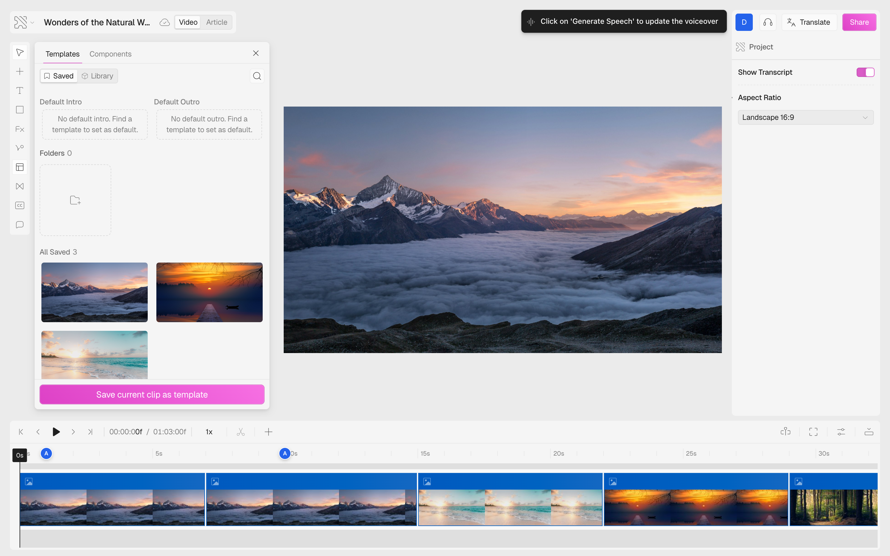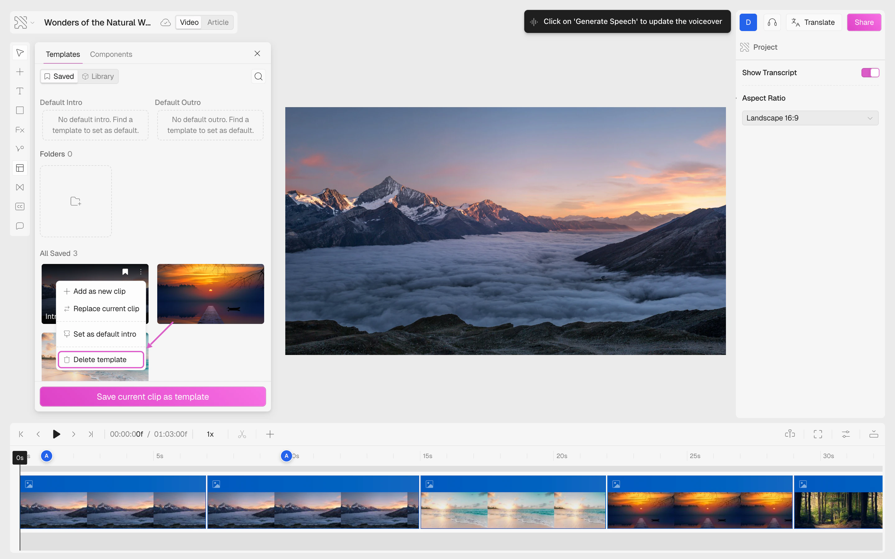 - Deleting a template does not affect existing projects — any videos that already use the template will keep their current content unchanged.