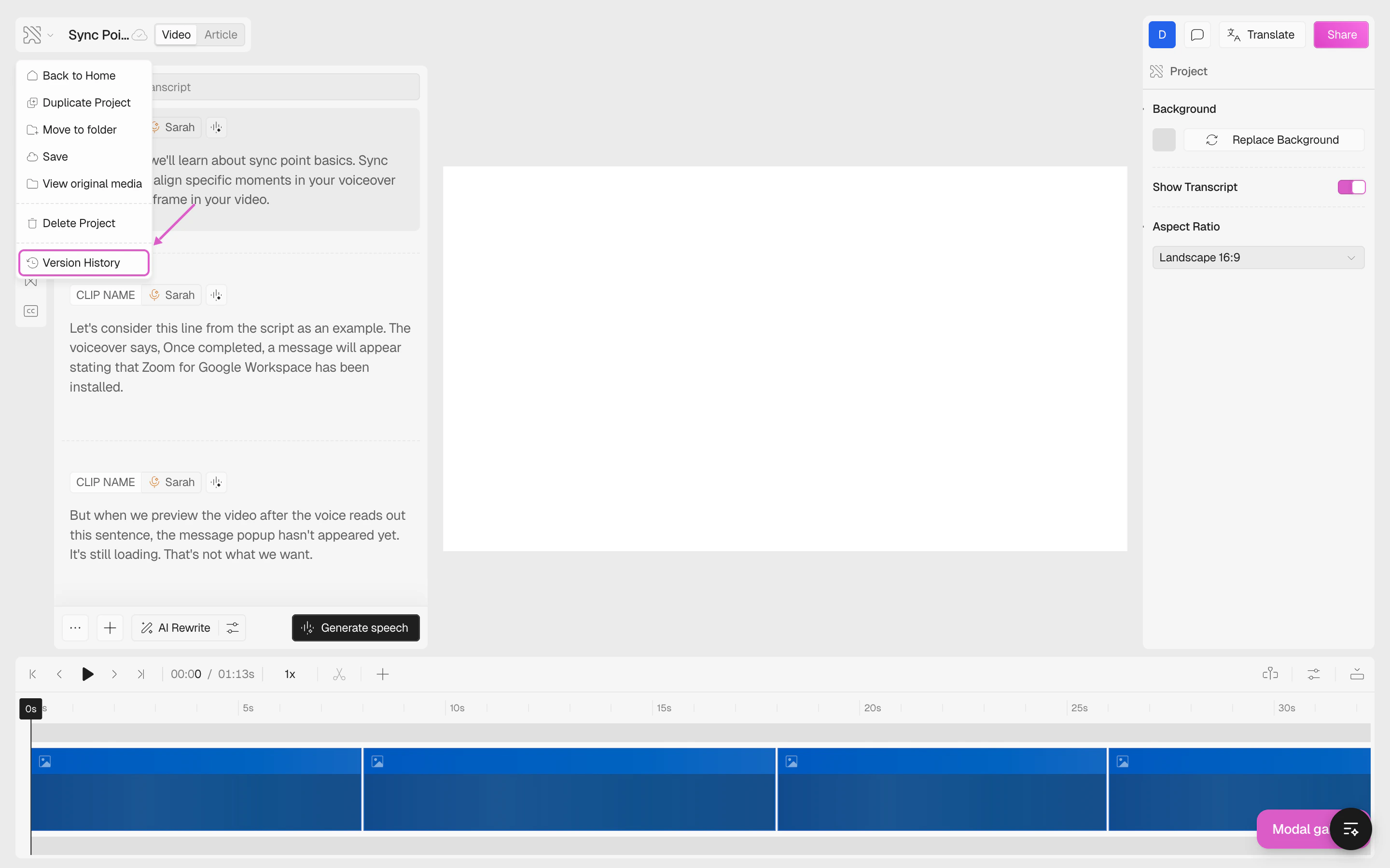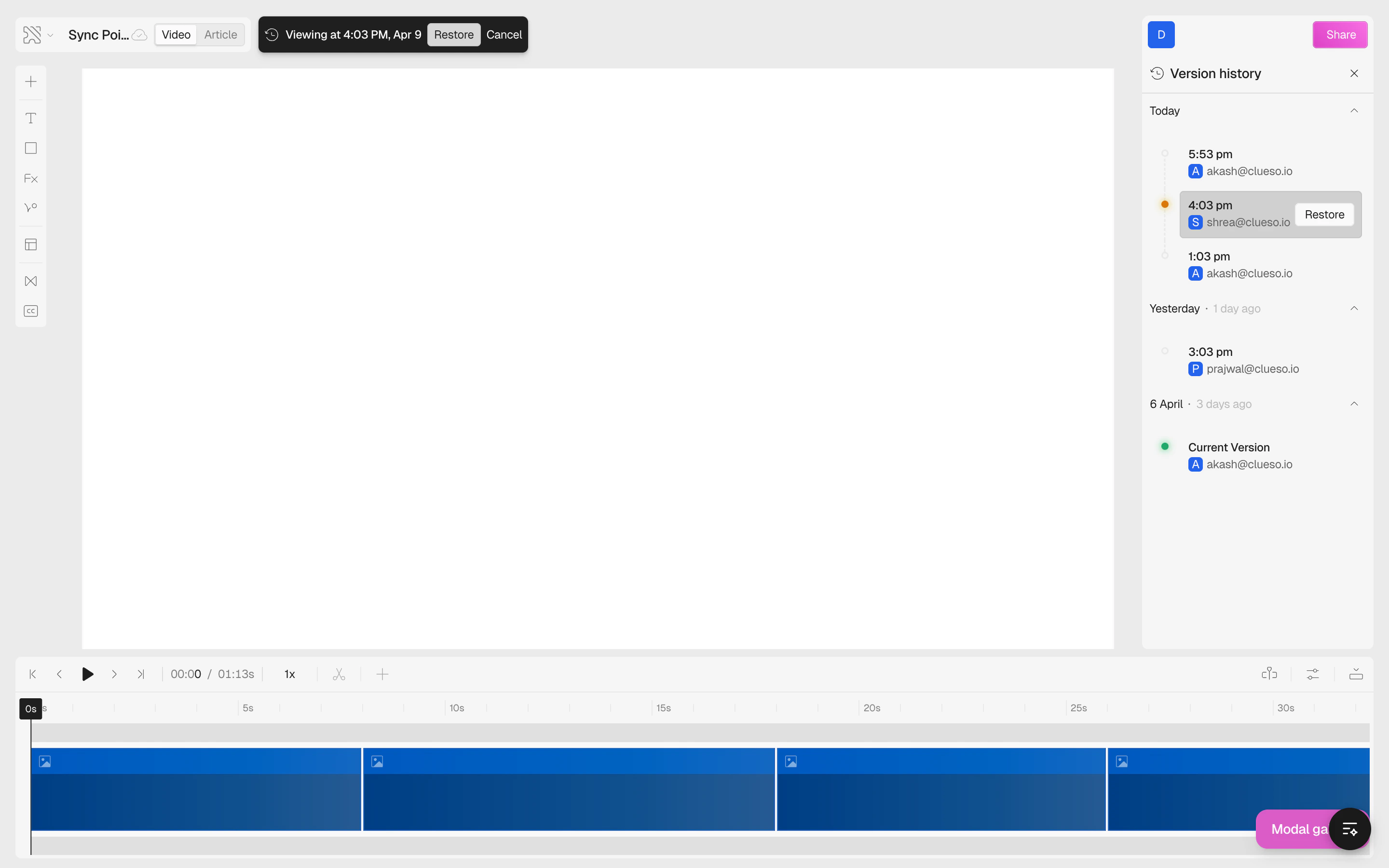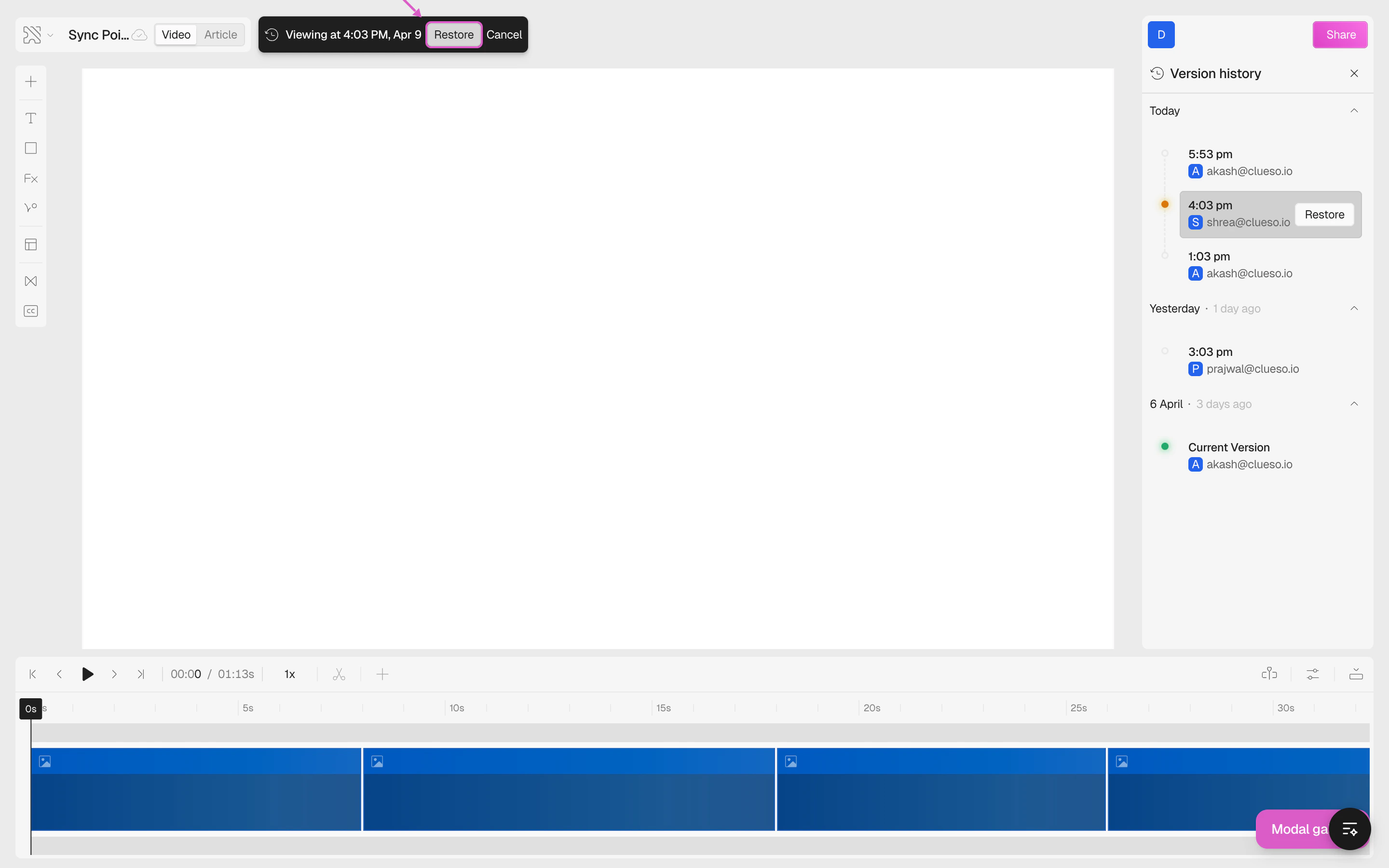On the right side, you’ll see all the previous versions of your project, grouped by date (Today, Yesterday, etc.).