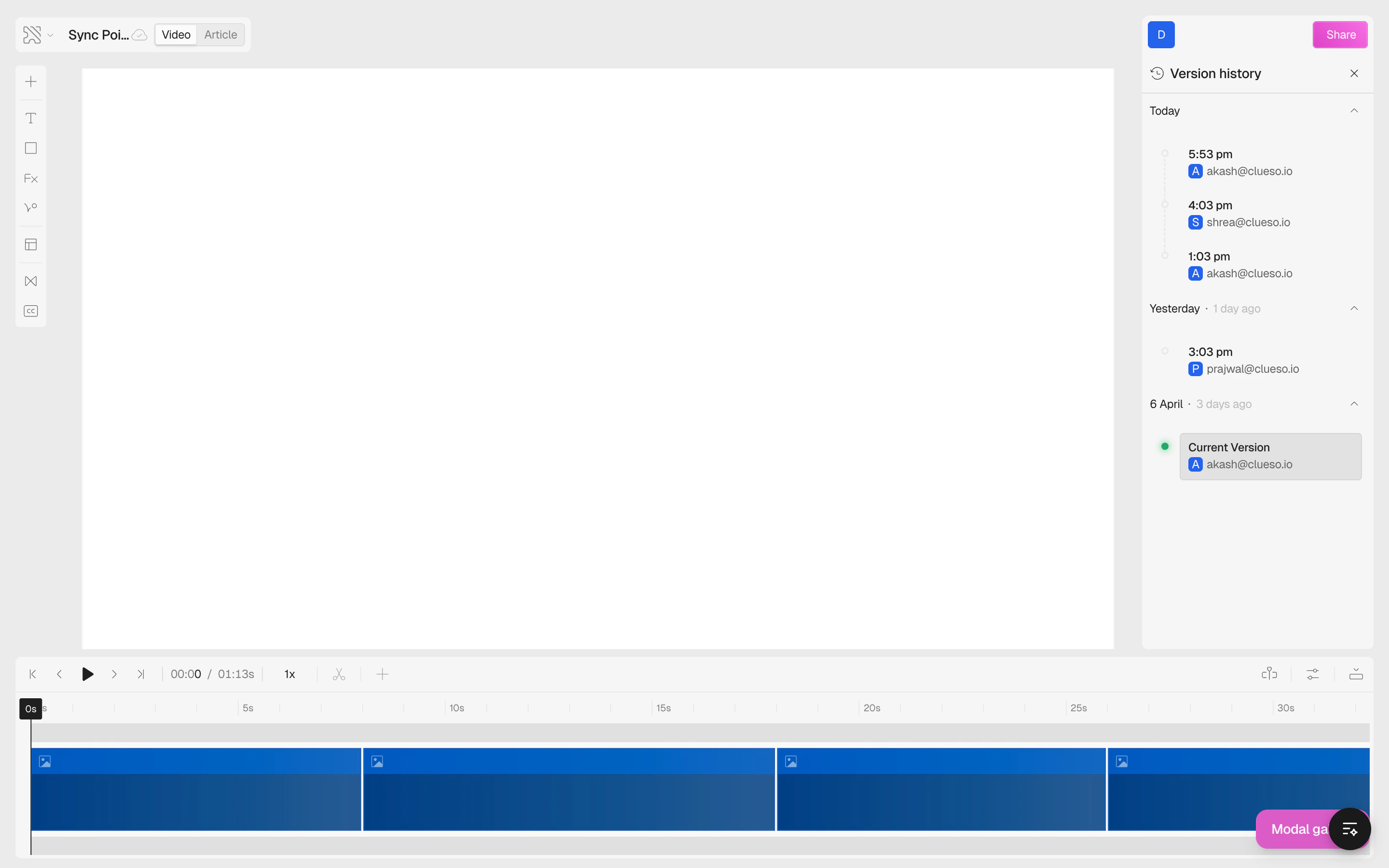 Clueso keeps saving all your changes automatically.Each version shows the time it was saved and who made the change. Your current version is marked with a green dot.