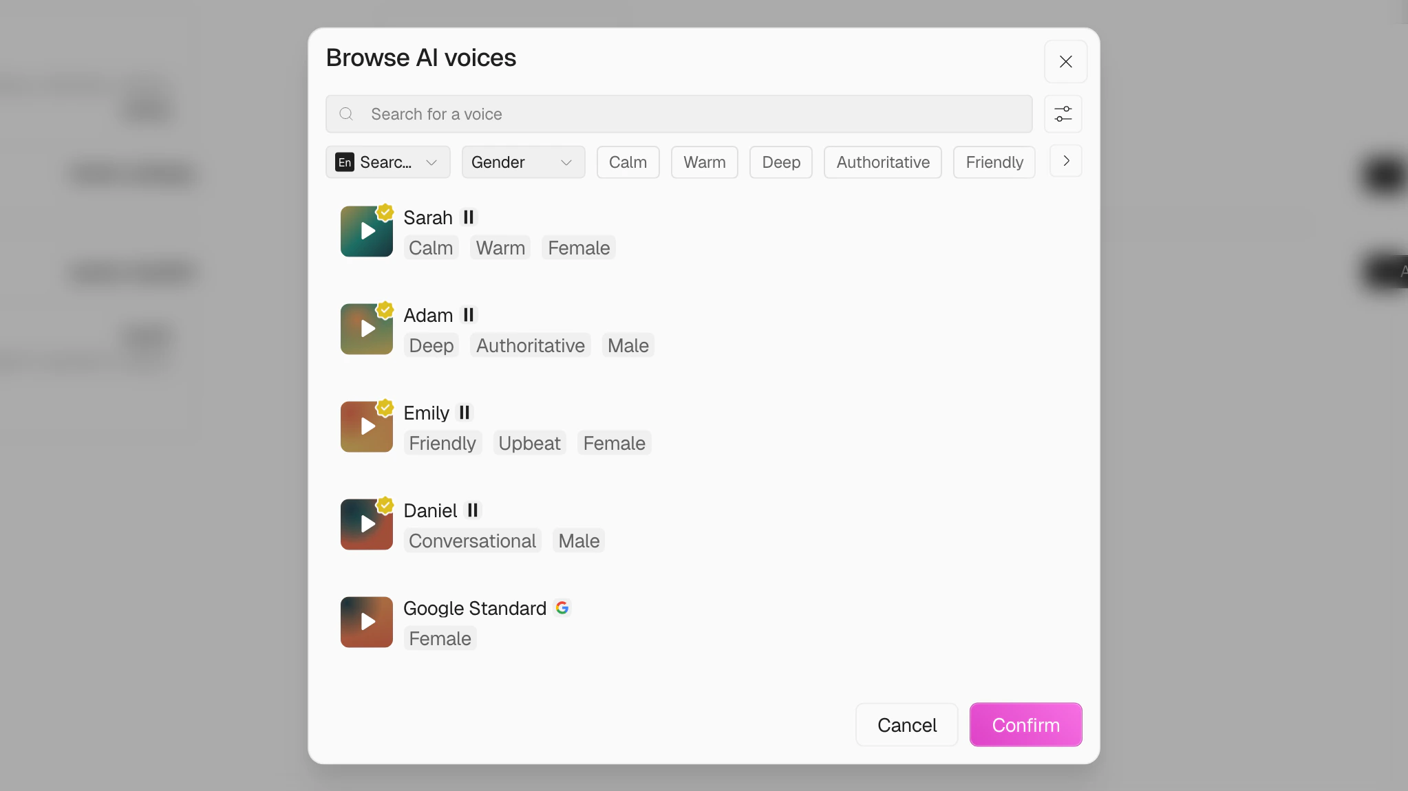 Click the play icon next to a voice to preview it. Once you’ve decided, select the voice and click Confirm to save.