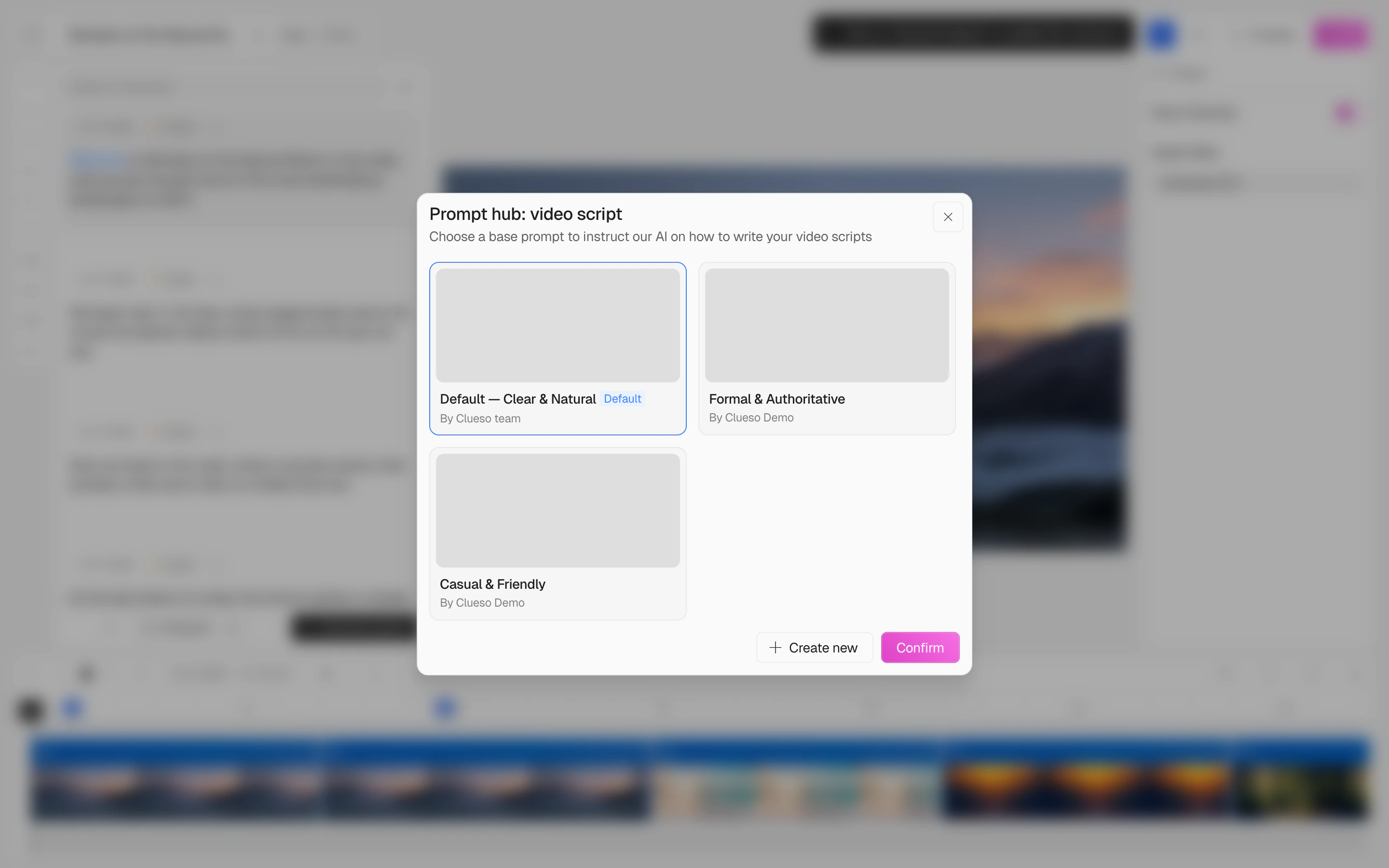Click on any prompt card to select it, then click Confirm to apply. The AI will now follow that prompt’s instructions when rewriting your video script.