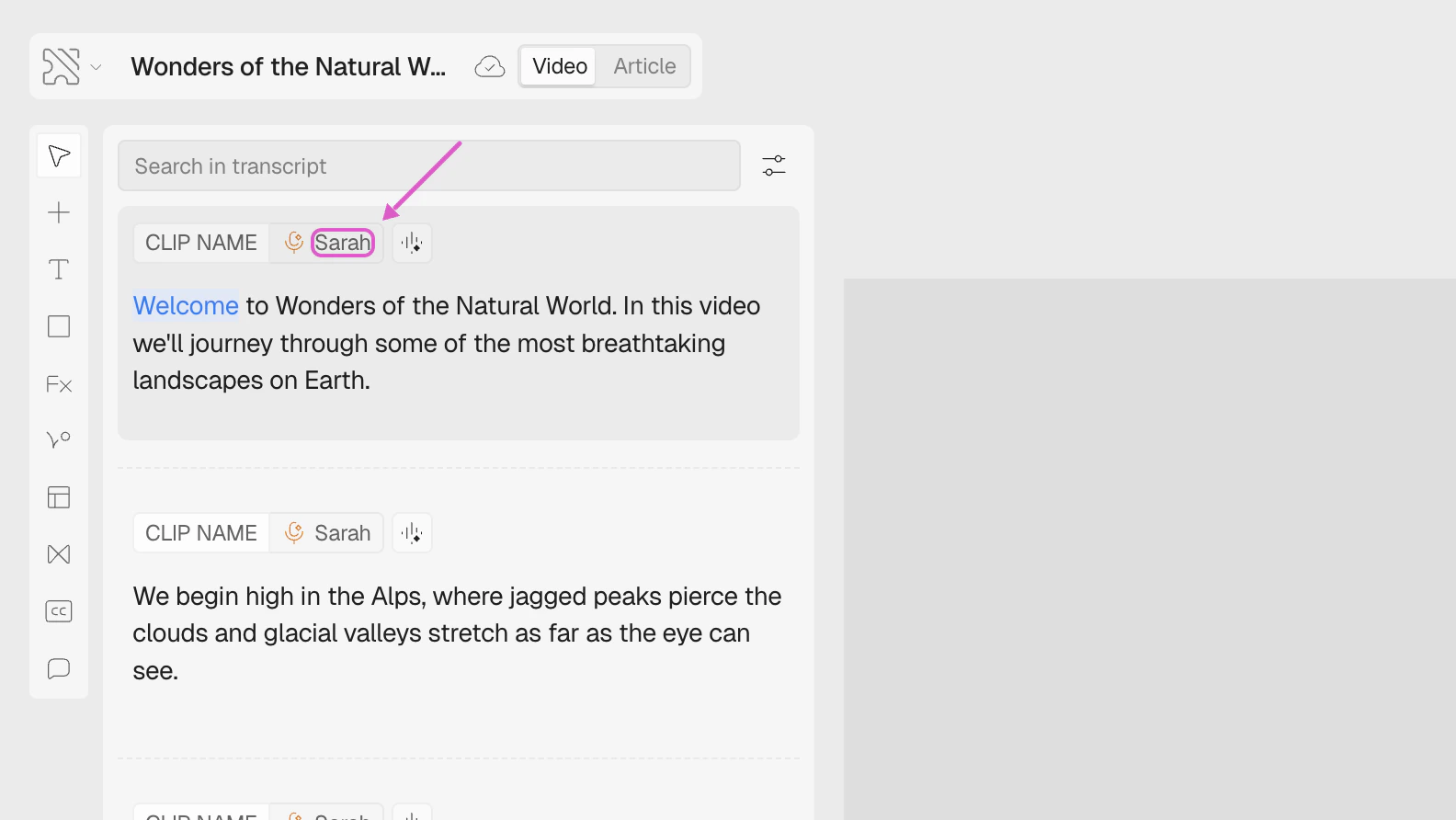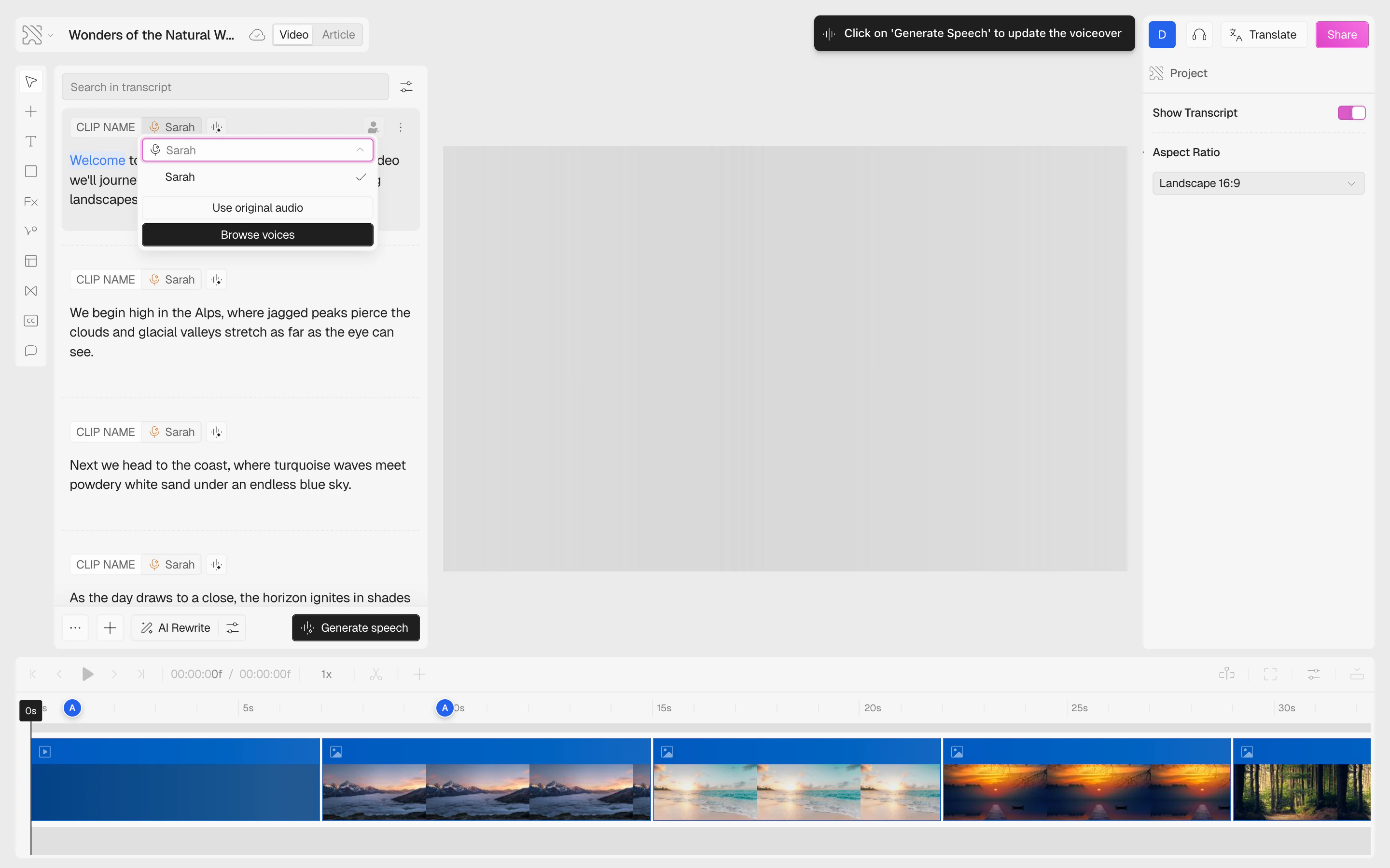 In the script panel, click on the voice name (e.g., “Sarah”) shown in the clip header. A dropdown will appear with your available voices.