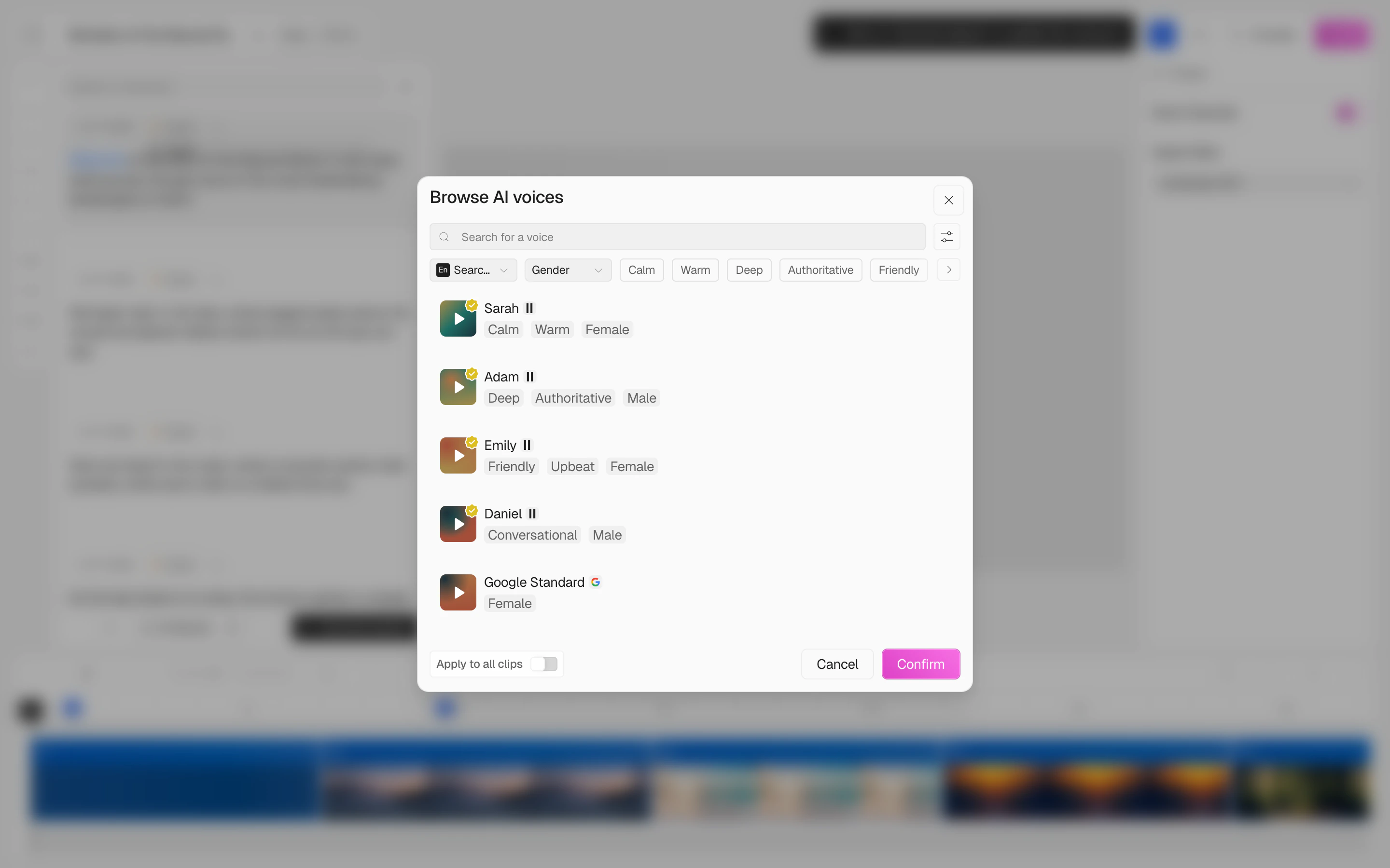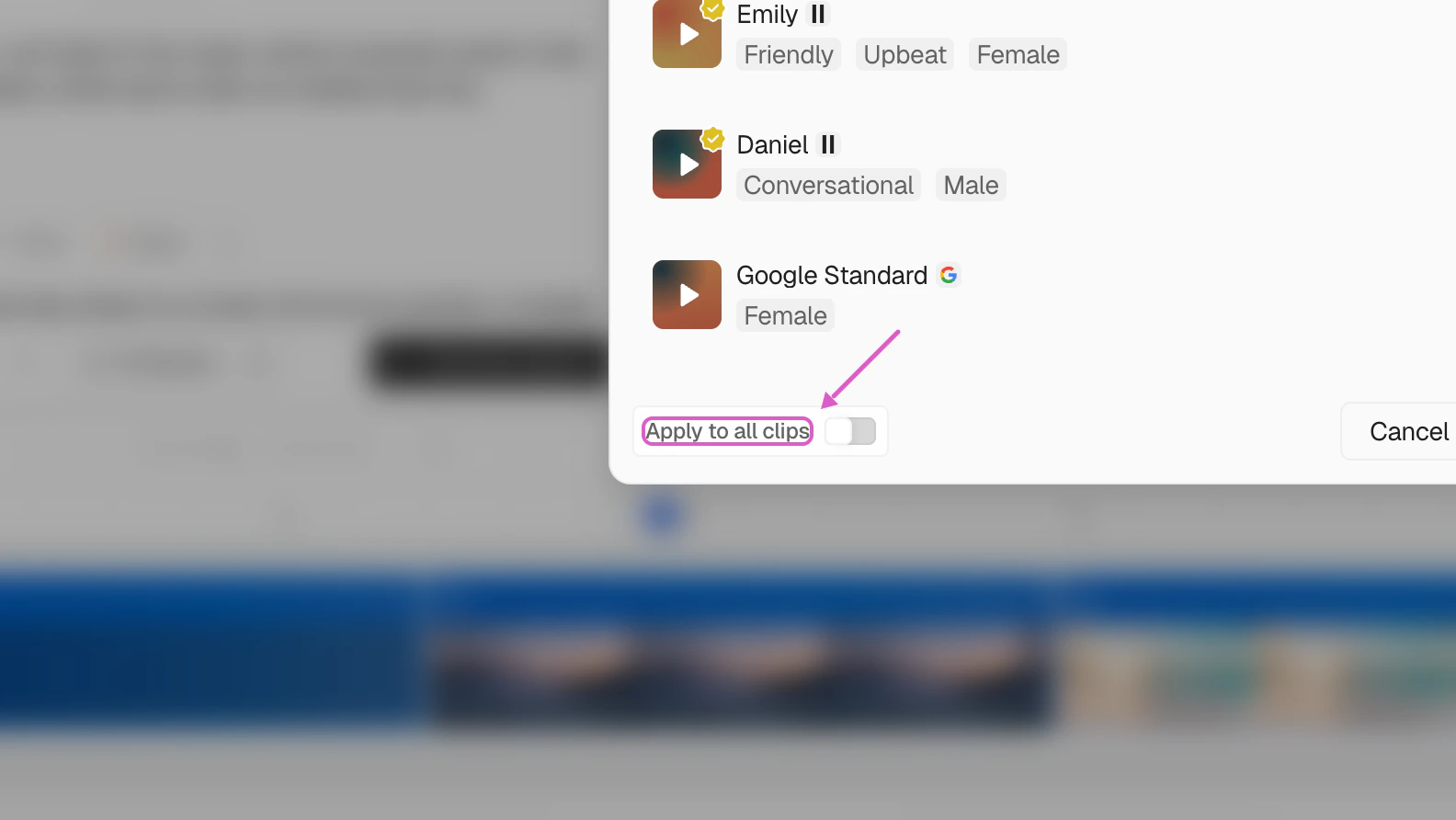 If you want the same pace across every clip in your video, toggle on Apply to all clips at the bottom-left of the voice picker.