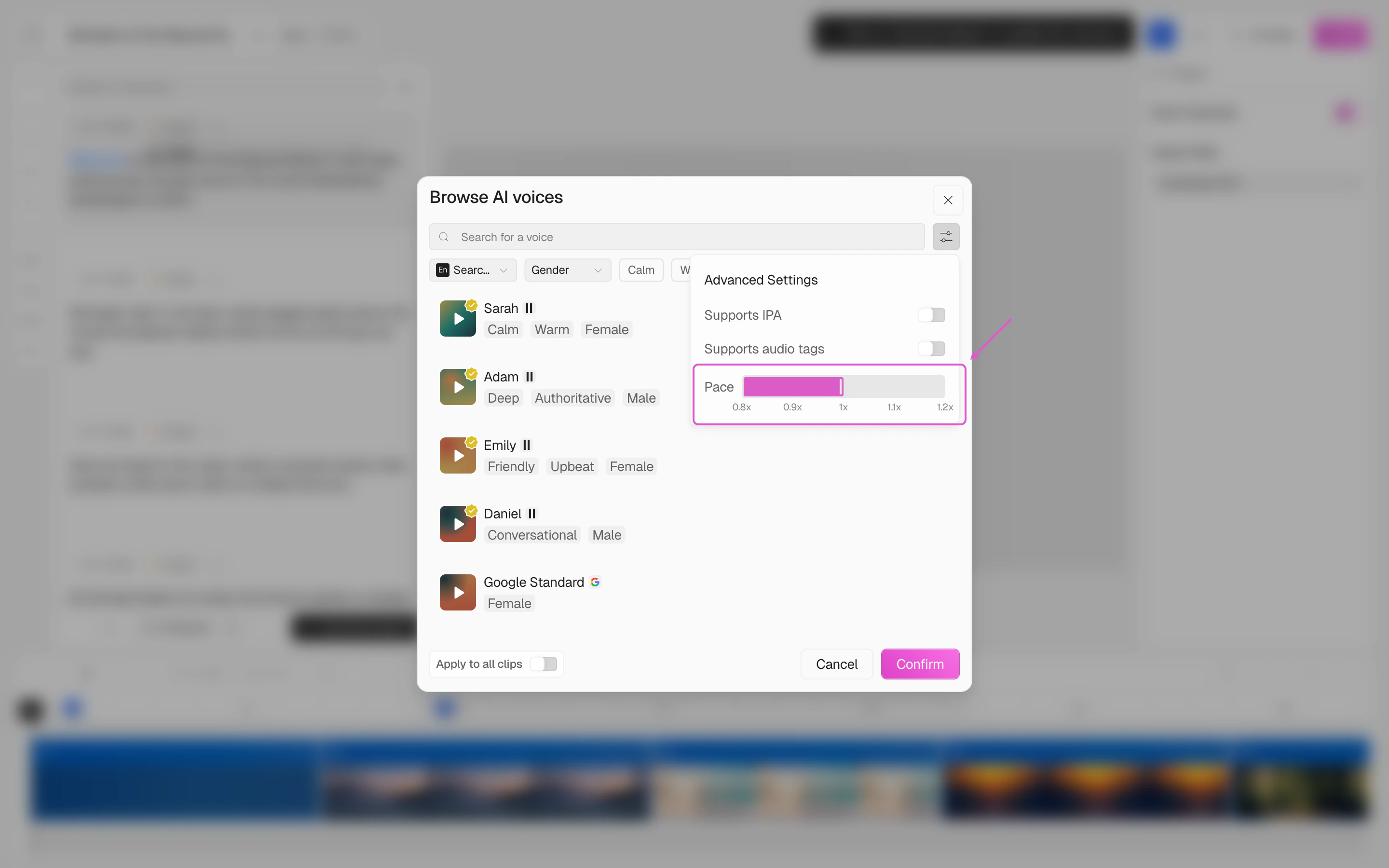 In the voice picker, click the filter icon (top-right of the search bar) to reveal the Advanced Settings panel. Here you’ll find the Pace slider.